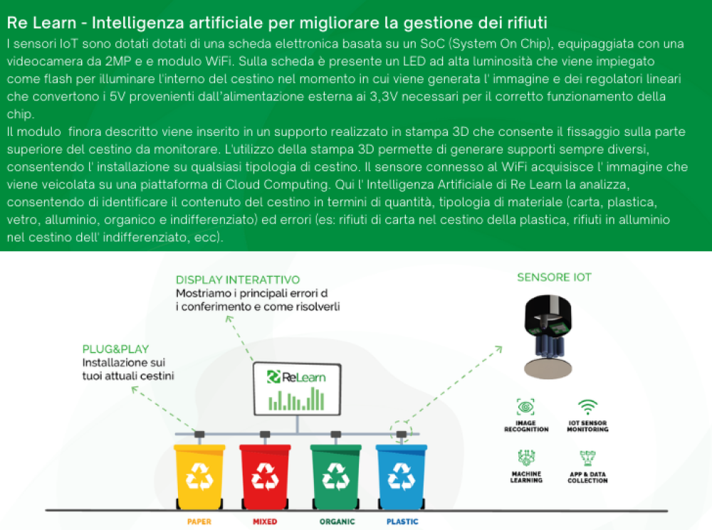 Re Learn è una startup innovativa che ha sviluppato un servizio di monitoraggio dei rifiuti plug&play che può essere personalizzato a seconda delle esigenze. Installando sui cestini dei rifiuti dei sensori IoT dotati di Intelligenza Artificiale siamo in grado di trasformali in innovativi smart bin. Grazie ai dati raccolti, Re Learn guida le aziende e i comuni nella scelta delle migliori strategie di CSR per ridurre sensibilmente l’impatto ambientale.