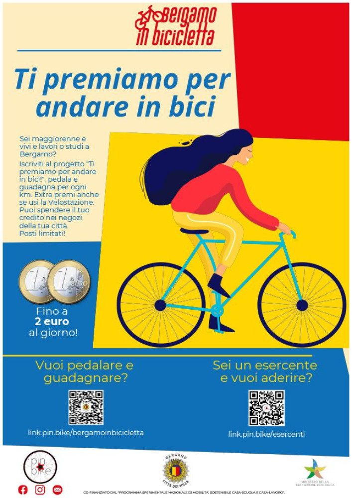 Gamification PIN BIKE: più pedali, più vieni premiato. I cittadini di Bergamo ricevono rimborsi chilometrici per i loro spostamenti in bicicletta, sotto forma di voucher elettronici utilizzabili presso attività commerciali locali di Bergamo, aderenti all'iniziativa.